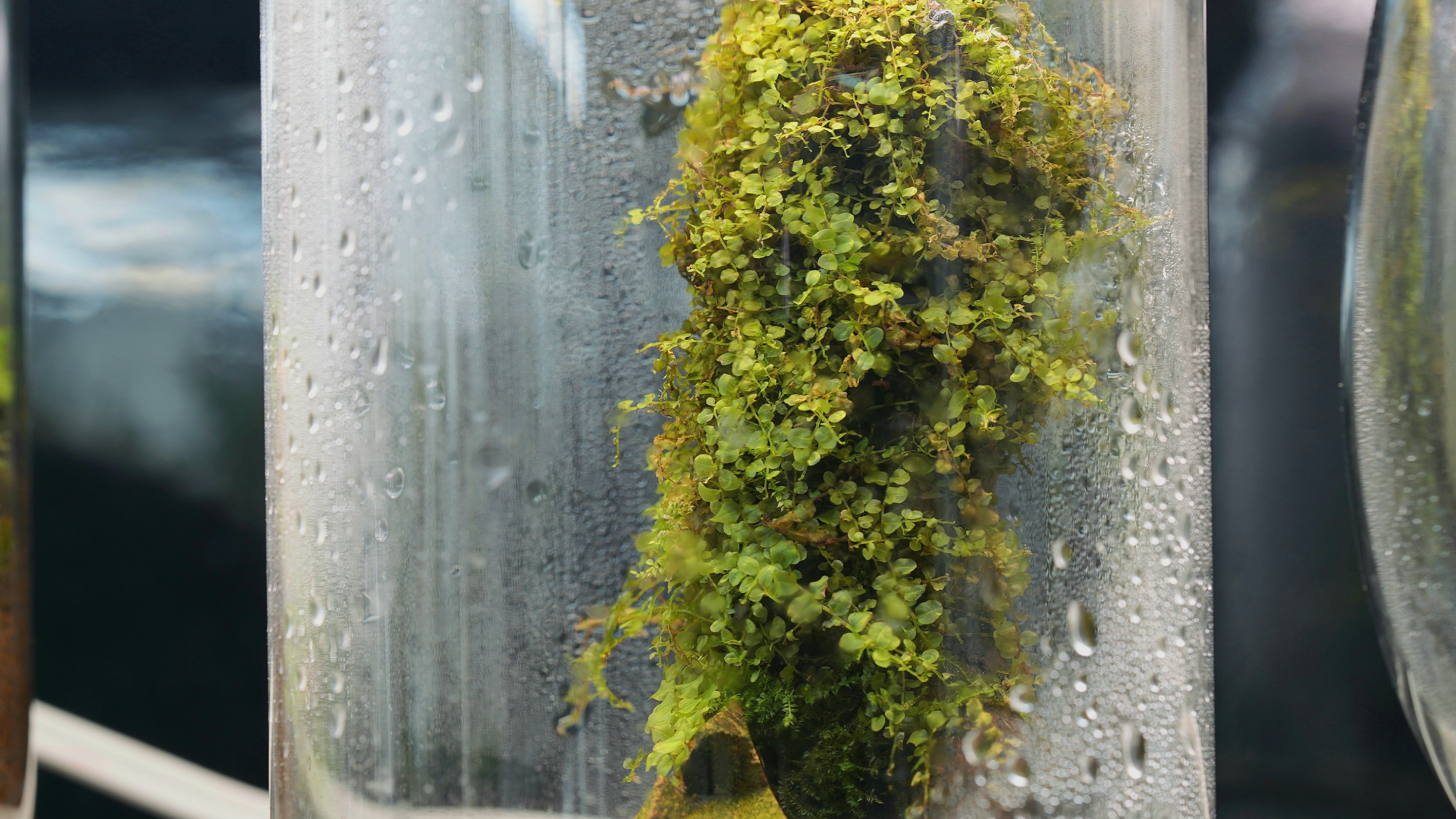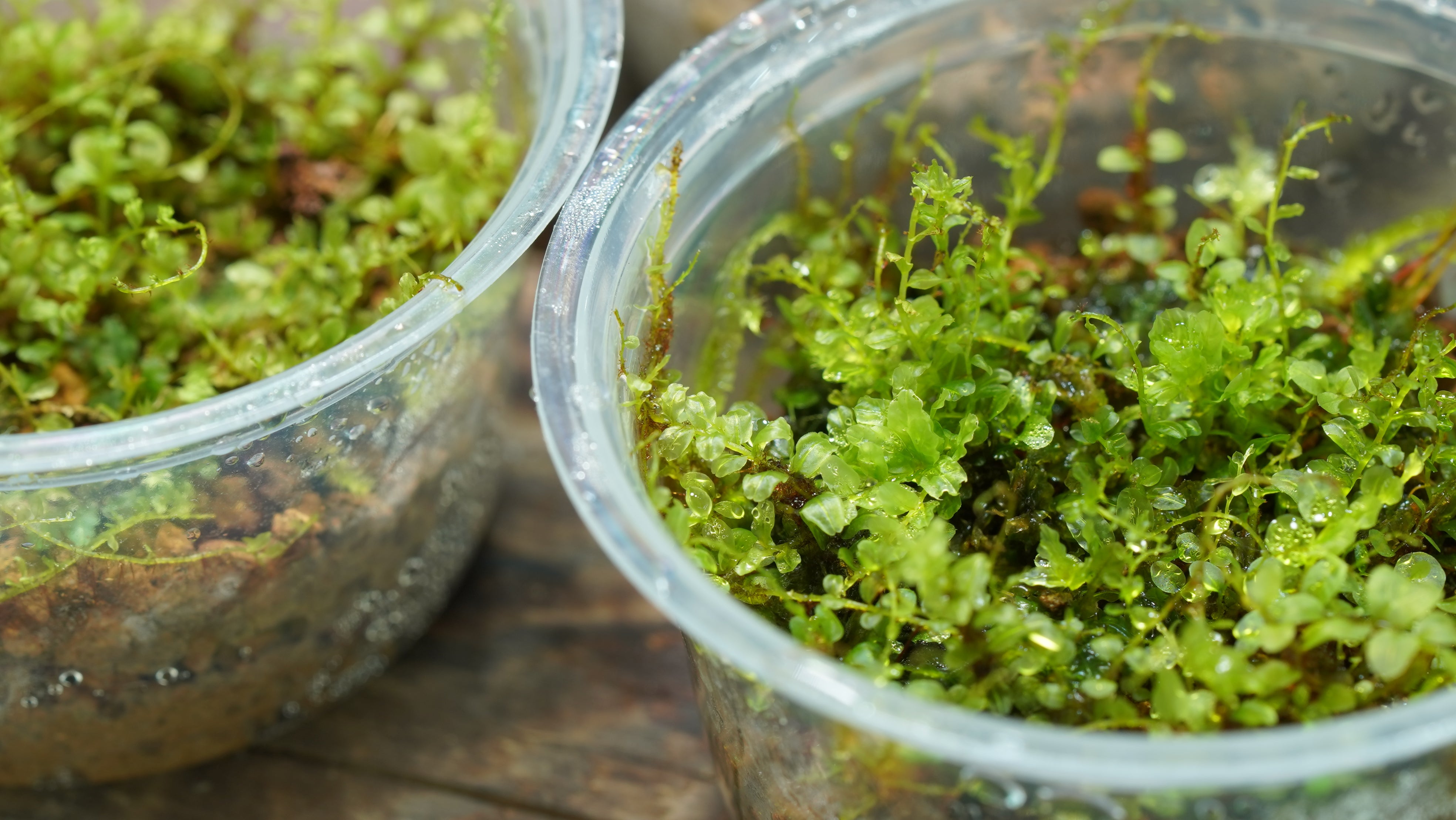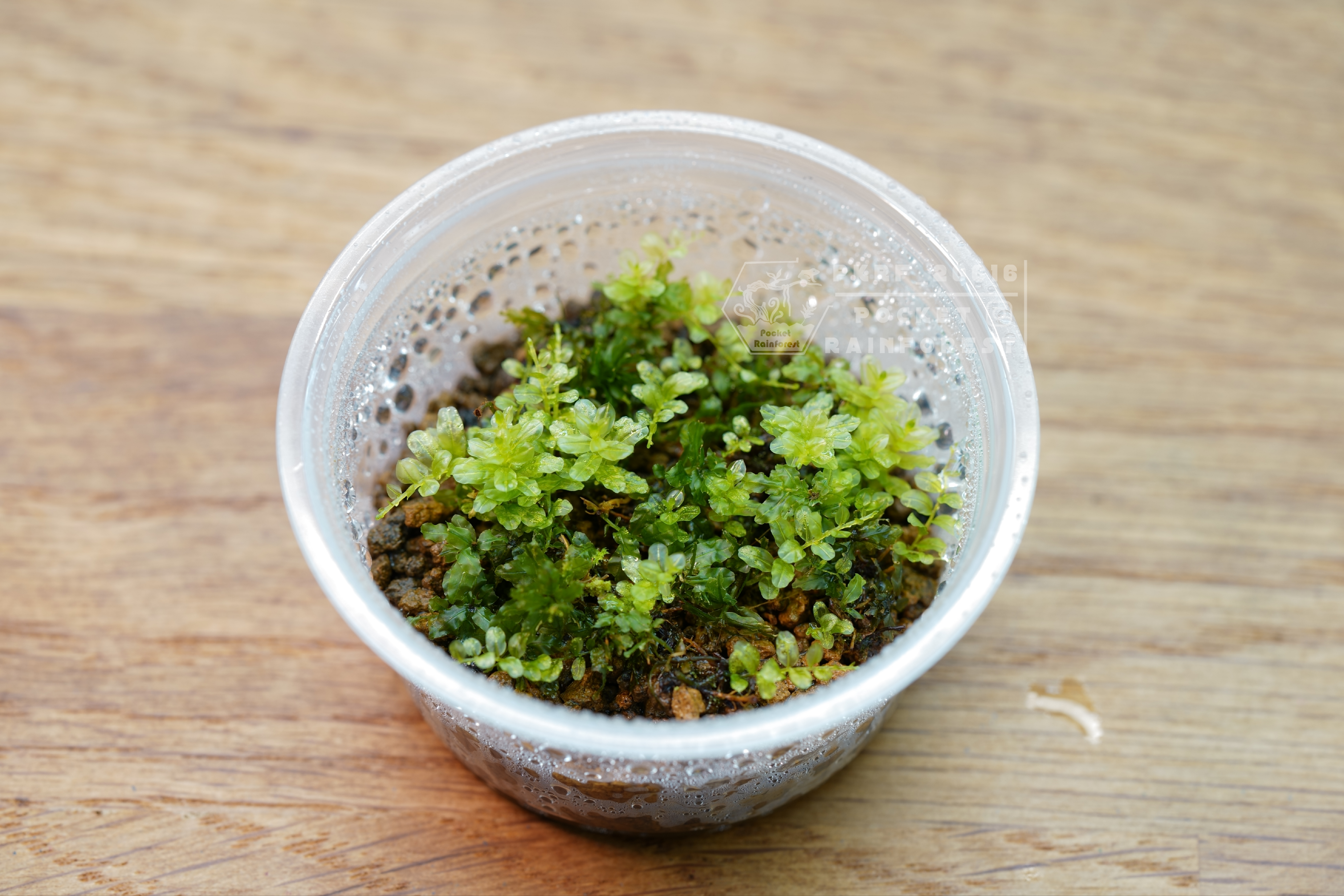 透明感十足的大圓葉是它的招牌特色,像水珠般閃亮。生長速度中等,葉面薄透,觸感細膩。怕熱怕曬,建議種植於陰涼潮濕環境。適合搭配其他匍匐苔或直立苔製造層次,是微景觀愛好者不可錯過的品種。當光線從側面打入時,整片葉面會閃出晶瑩綠光,是非常搶眼的鋪地品種。