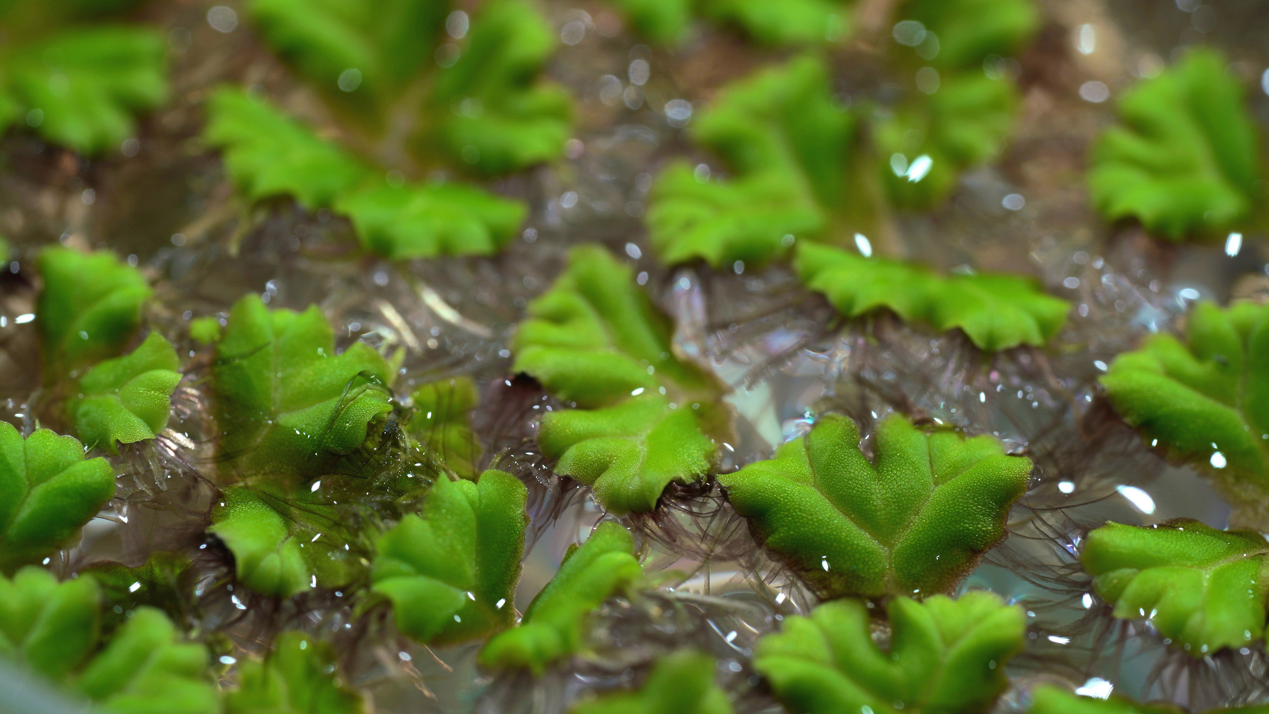 浮蘚屬於水中型苔蘚,葉狀體分裂成愛心形,每片翠綠透明,搭配裂葉增生的獨特結構非常可愛。生長速度適中,喜歡半日照,放在光線柔和的環境最能保持色澤與生長。需注意水溫變化,避免高溫或忽冷忽熱,以免植體萎縮或軟化。適合用作水陸造景或玻璃盆中浮植層,是搭配水生植物與小型石景的理想選擇。